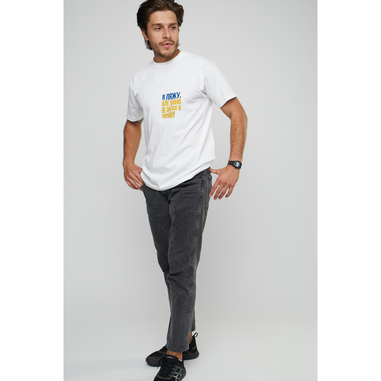 Футболка чоловіча біла"Я ляжу, але воно не заїде в Україну"